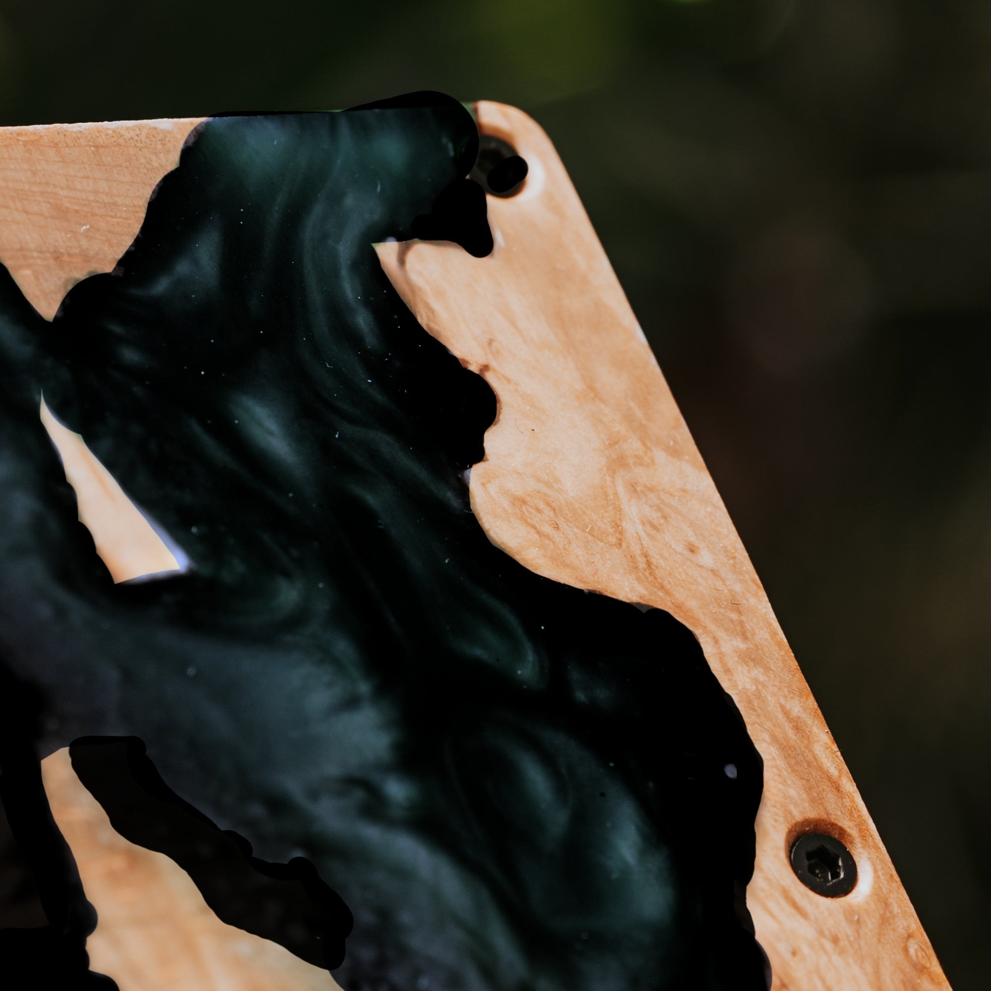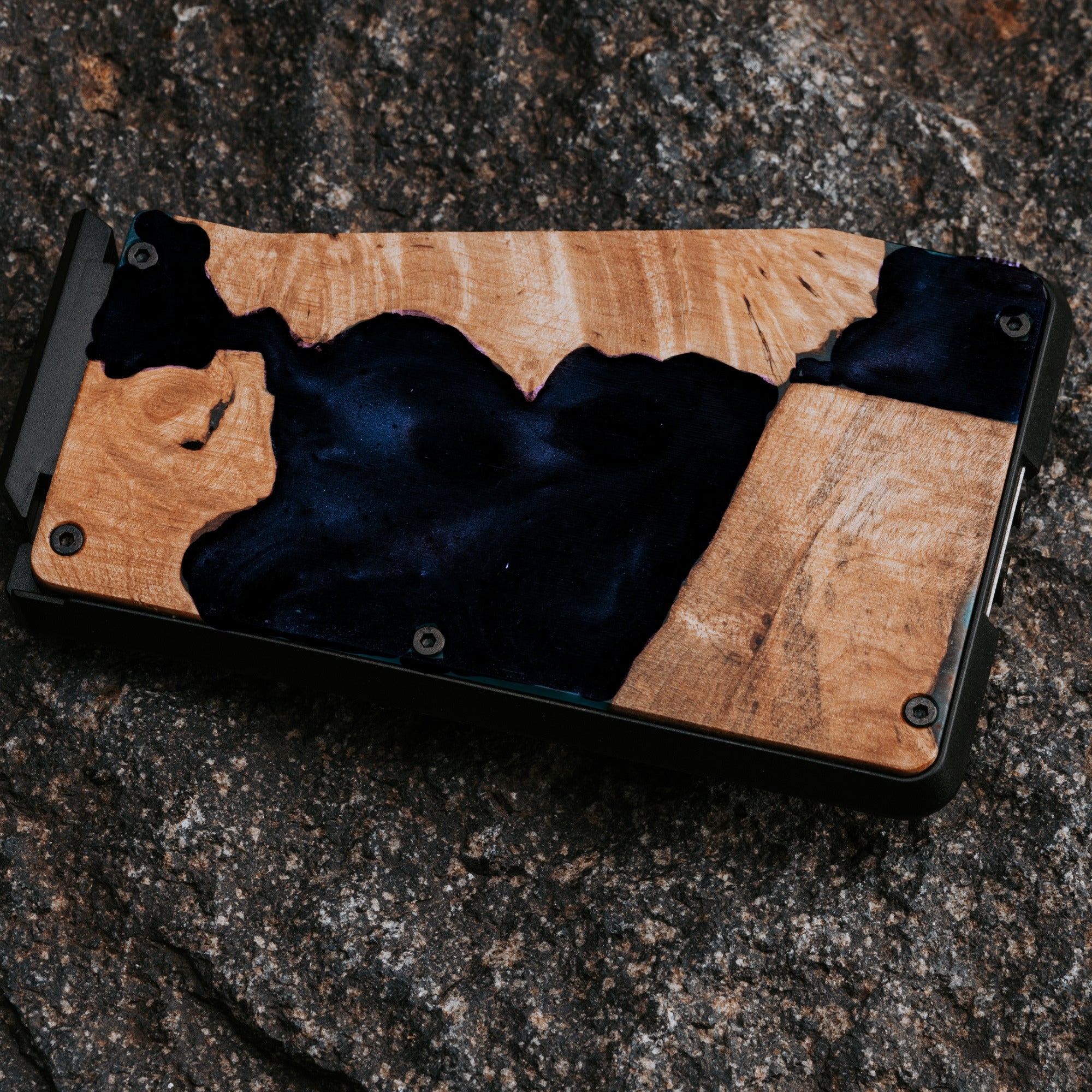 Introducing the Black Wood Wallet for Men, a fusion of modern aesthetics and practicality featuring a natural maple wood finish complemented by vibrant hand-painted resin and aluminum accents. The inclusion of a lever enhances card accessibility as they elegantly fan out.