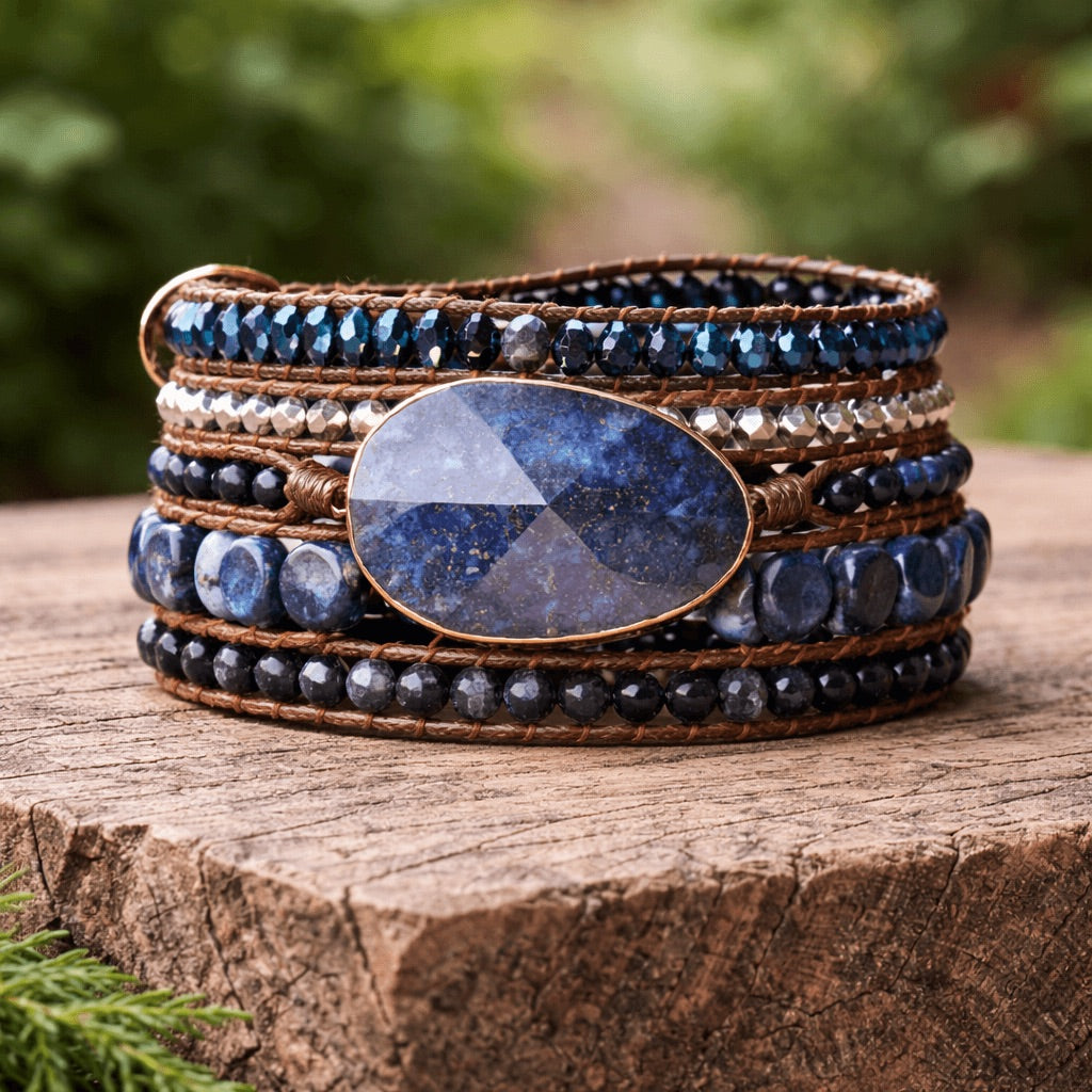 Built from layered stone and leather, the Night Ridge Lapis Wrap Bracelet reflects the depth of dark skies and worn terrain. At the center sits a lapis stone with natural variation and flecks of gold, surrounded by rows of sodalite and dark beads that add texture and weight. The multi-wrap design, bound with genuine leather, creates a structured feel that stays comfortable through everyday wear. Each piece carries its own pattern and tone, shaped by natural materials and time. Made to move with you—on the trail, in the city, and everywhere between. Grounded in stone. Built in layers. Made to last.