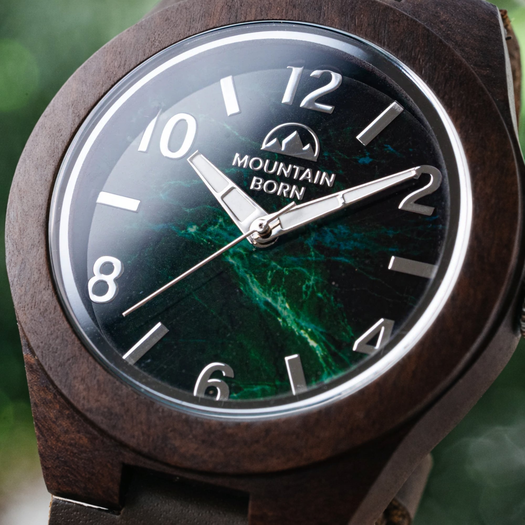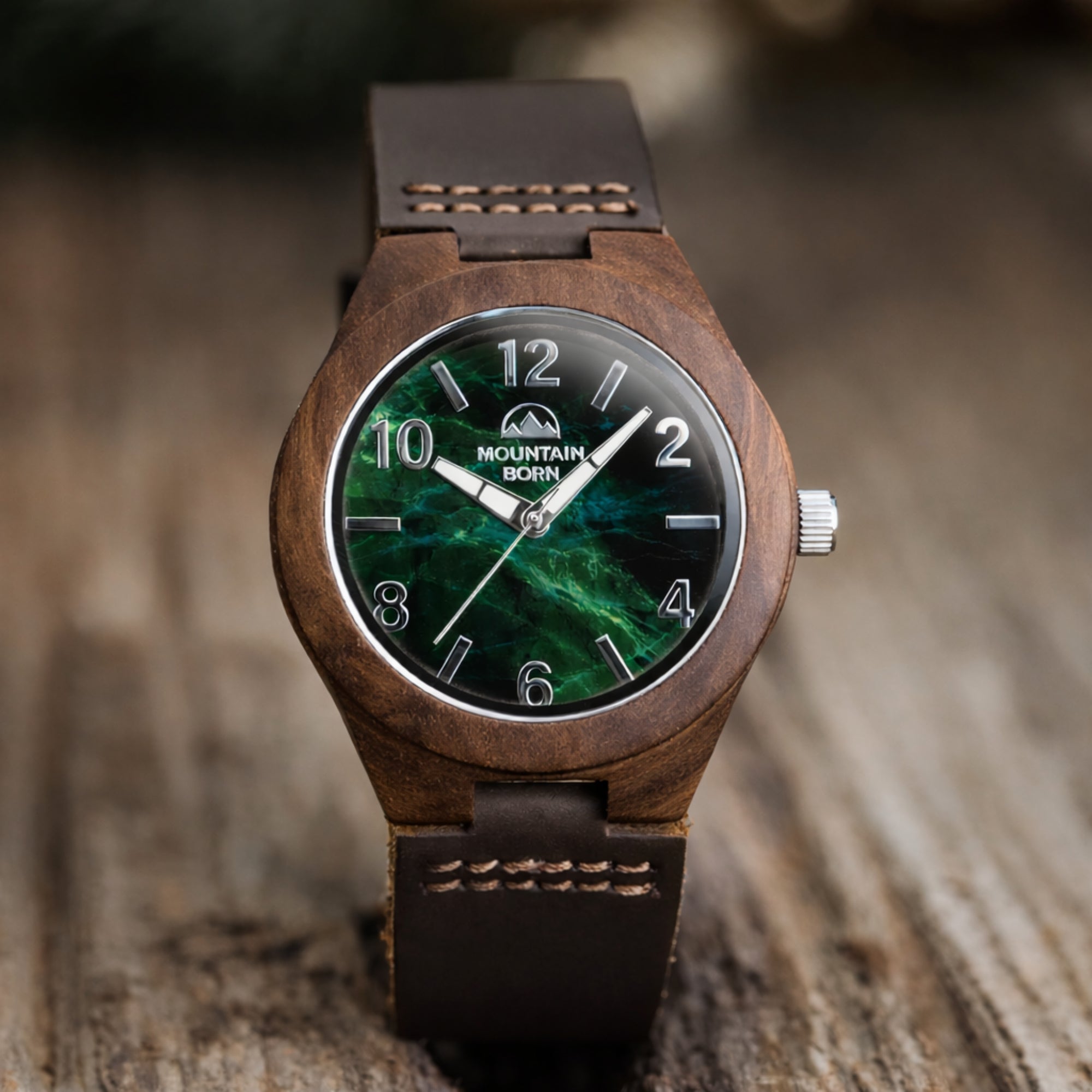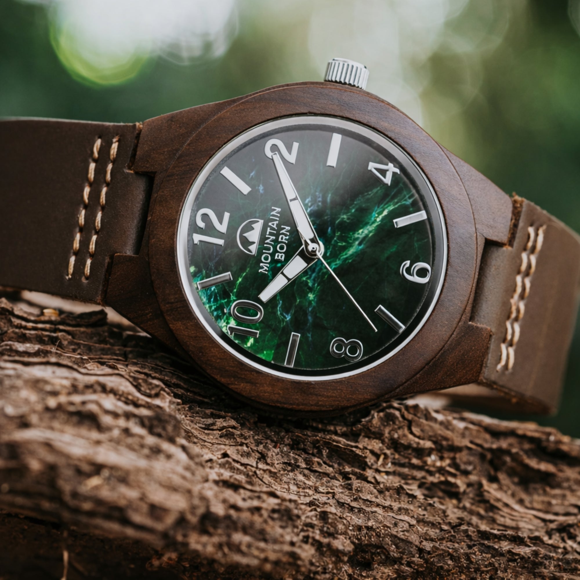 In the realm of timekeeping at Mountain Born, our wood watches are not just instruments; they're artisanal expressions of sustainability and a profound connection with nature. In stark contrast to conventional watches, each wood timepiece we create is a masterpiece, intricately designed from ethically sourced wood that tells a story of renewal and authenticity.